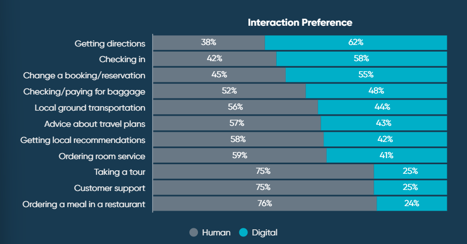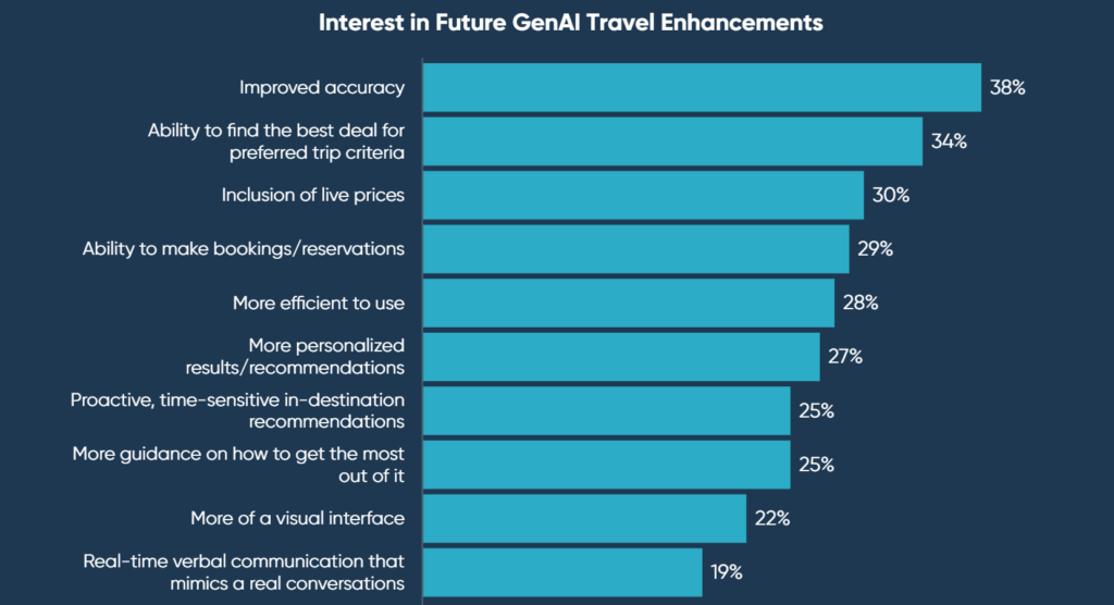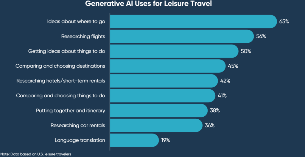 Il 18% il tasso complessivo di utilizzo della genAI tra i viaggiatori. Il 65% dei viaggiatori che usa la genAI lo fa per ispirazione e per cercare destinazioni di viaggio e il 41-50% la usa per avere idee su cosa fare in loco, comparare attività e prendere decisioni di viaggio.
